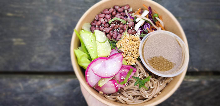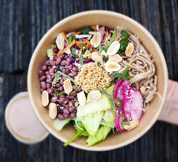 VEGGIE SOBA: Une salade complète de saison aux saveurs asiatiques! Salade, nouilles au sarrasin, coleslaw cébette, radis d’hiver Bio au sésame blanc, haricots azuki, pickles de graines de moutarde, shiso, cacahuètes, vinaigrette asiatique sucrée.